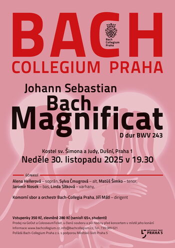 Radostný text tzv. Mariina chvalozpěvu - Magnificat, byl pro skladatele vždy bohatou inspirací a stal se jedním z nejčastěji zhudebňovaných liturgických textů. Bachovo Magnificat je jedno z nejvýstižnějších uchopení tématu a patří k jeho nejlepším sborovým dílům. Srdečně zveme na tuto mimořádnou hudební událost do kostela sv. Šimona a Judy na prahu doby adventní.